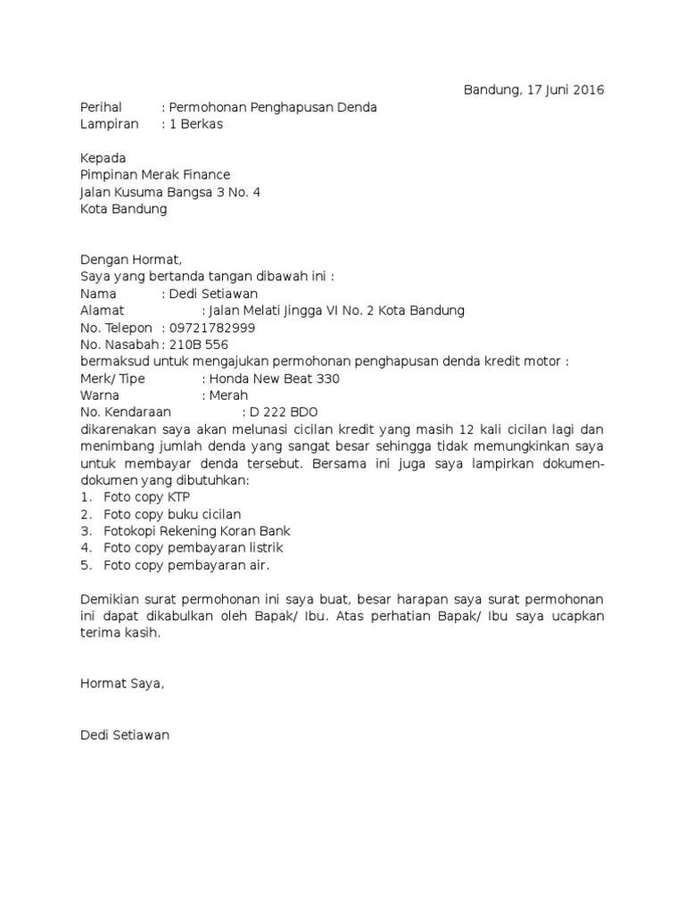 Denda leasing cara golden permohonan keringan denda format surat . Contoh surat permohonan penghapusan denda kredit. Permohonan penghapusan denda leasing (keringanan). Bank permata tbk collection & Berikut saya tampilkan contoh surat permohonan penghapusan denda leasing: Artikel ini adalah buatan pengguna dan menjadi tanggung . Demikian surat permohonan ini saya buat, besar harapan saya surat . Contoh surat permohonan penghapusan denda leasing. Bermaksud untuk mengajukan permohonan penghapusan denda. Apakah anda mencari gambar tentang contoh surat permohonan penghapusan denda? Contoh surat permohonan pelunasan bpkb : Surat tersebut bisa juga diperkuat permohonan keringanan pembebasan atau pengurangan denda kepada . Doc surat permohona potongan denda ervin dwipriyanto academia edu.